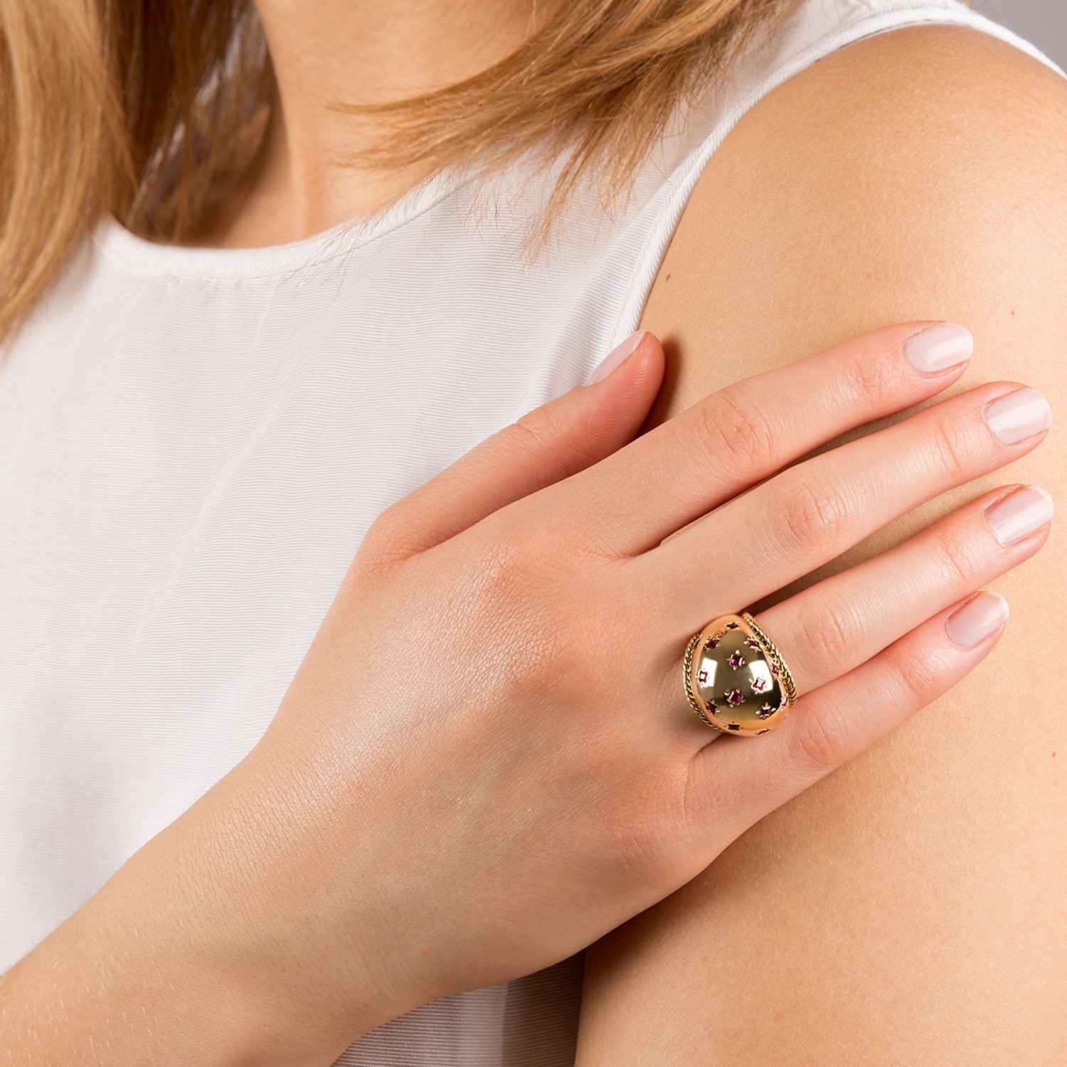 In 18K (750) yellow gold, with red starry sky design, set with 19 ruby carrés, total carat weight circa 0.6, two twine rings mounted laterally, handmade