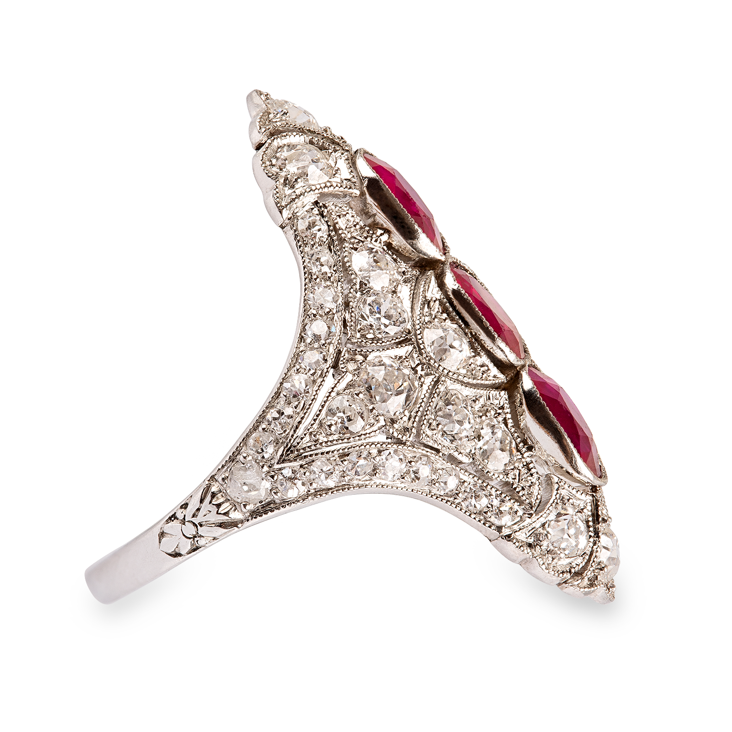 In (950) platinum, set with an oval ruby and two cushion-cut rubies, weighing a total of circa a.1.5 carats, vivid red (GRS type "pigeon's blood"), Burma (Mogok, Myanmar), no indication of thermal treatment, set with 54 old-cut and rose-cut diamonds, handmade