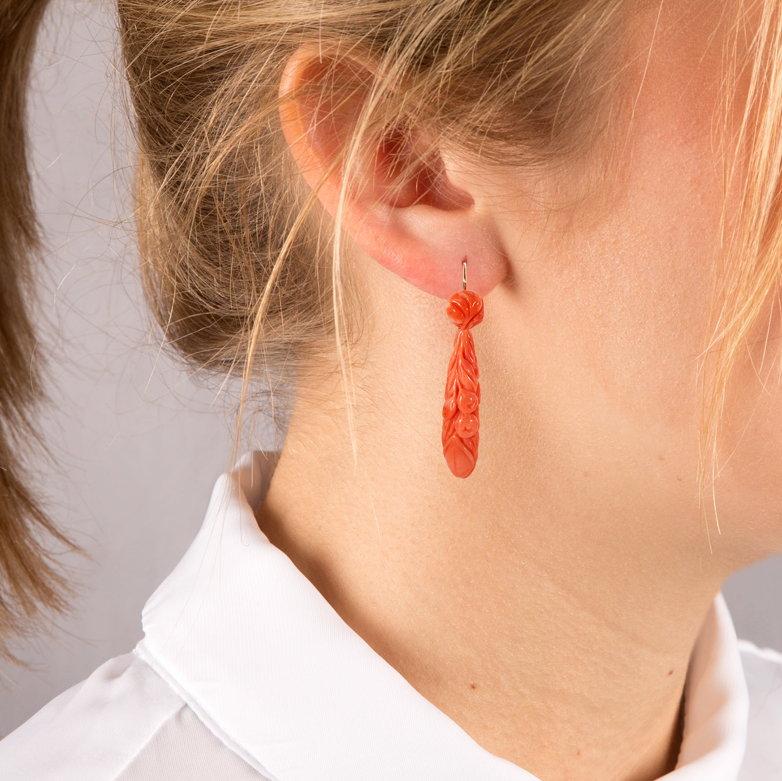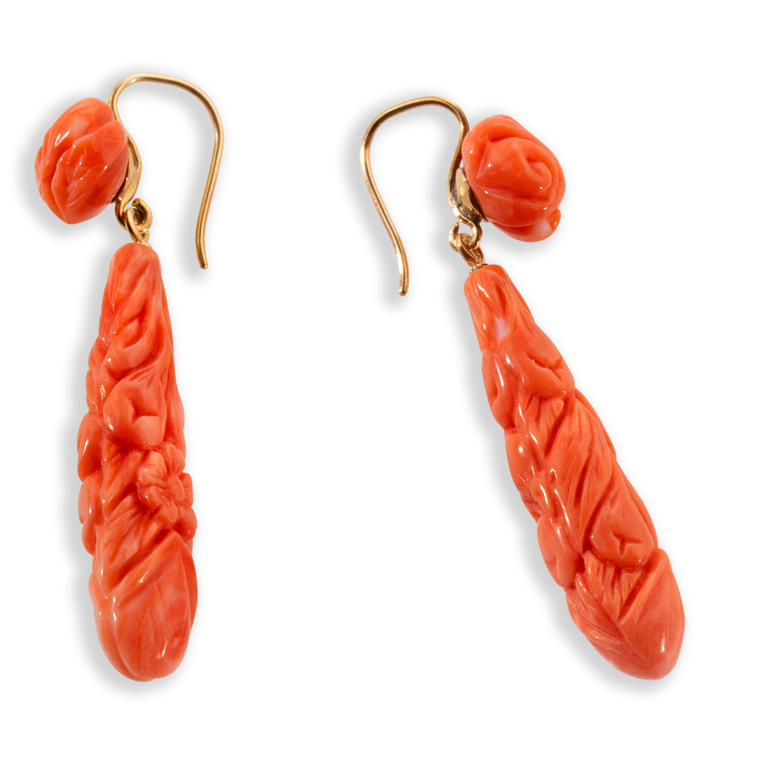 In 14K (585) yellow gold, set with beautiful Mediterranean corals (probably from Sardinia) with engraved fruits, flowers and leaves, hook system, handmade