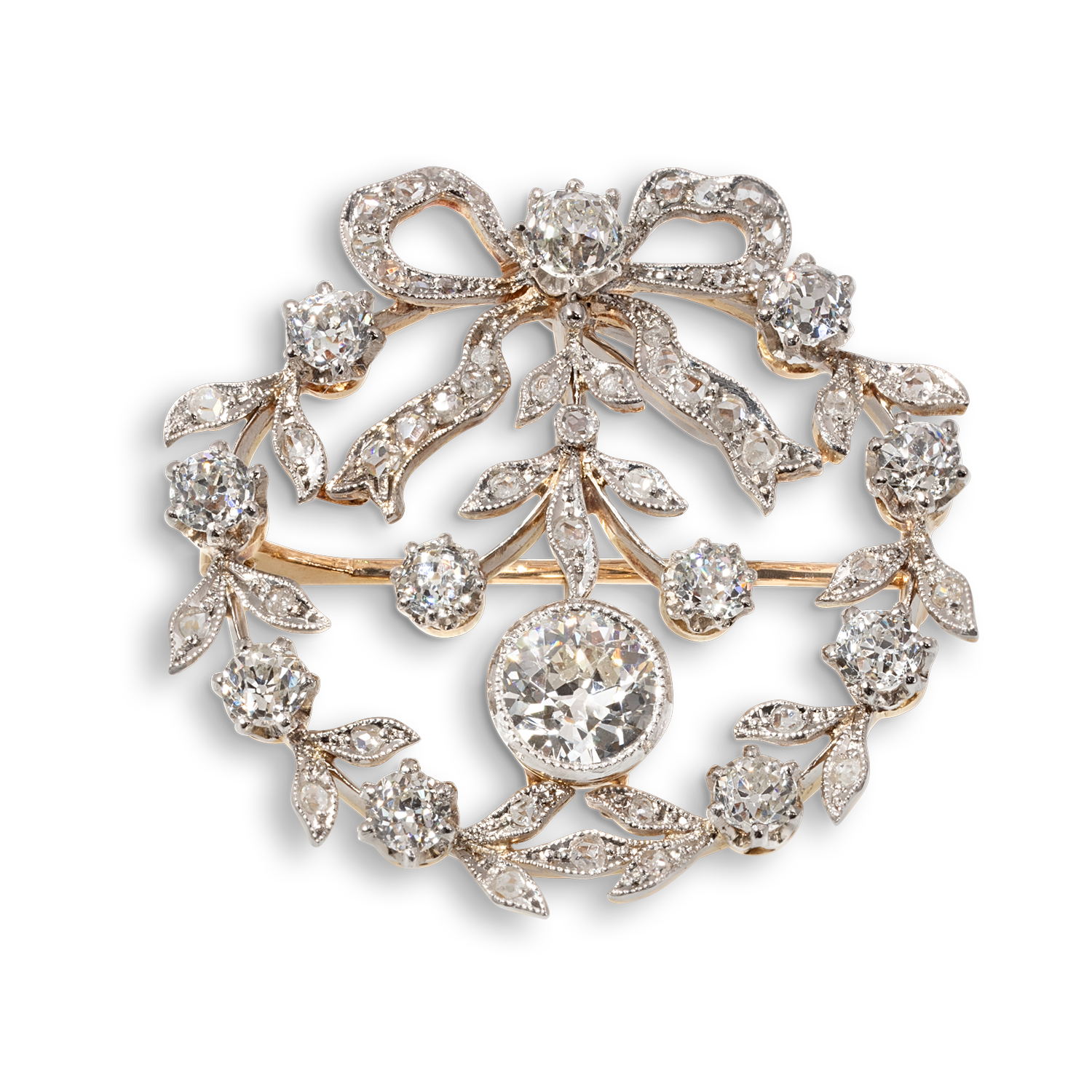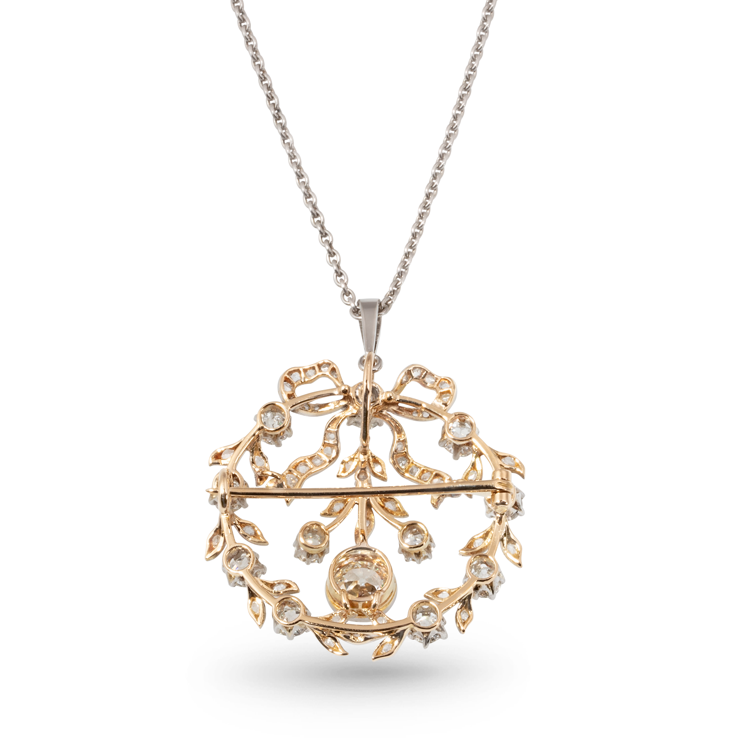 Enchanting pendant/brooch in 18K (750) yellow gold with a layer of platinum, designed as a ribbon with a wreath of leaves, center set with an old-cut diamond weighing approximately 0.70 carats, H/si, and 11 small old-cut diamonds weighing a total of circa 1.10 carats, set with rose-cut diamonds, handmade