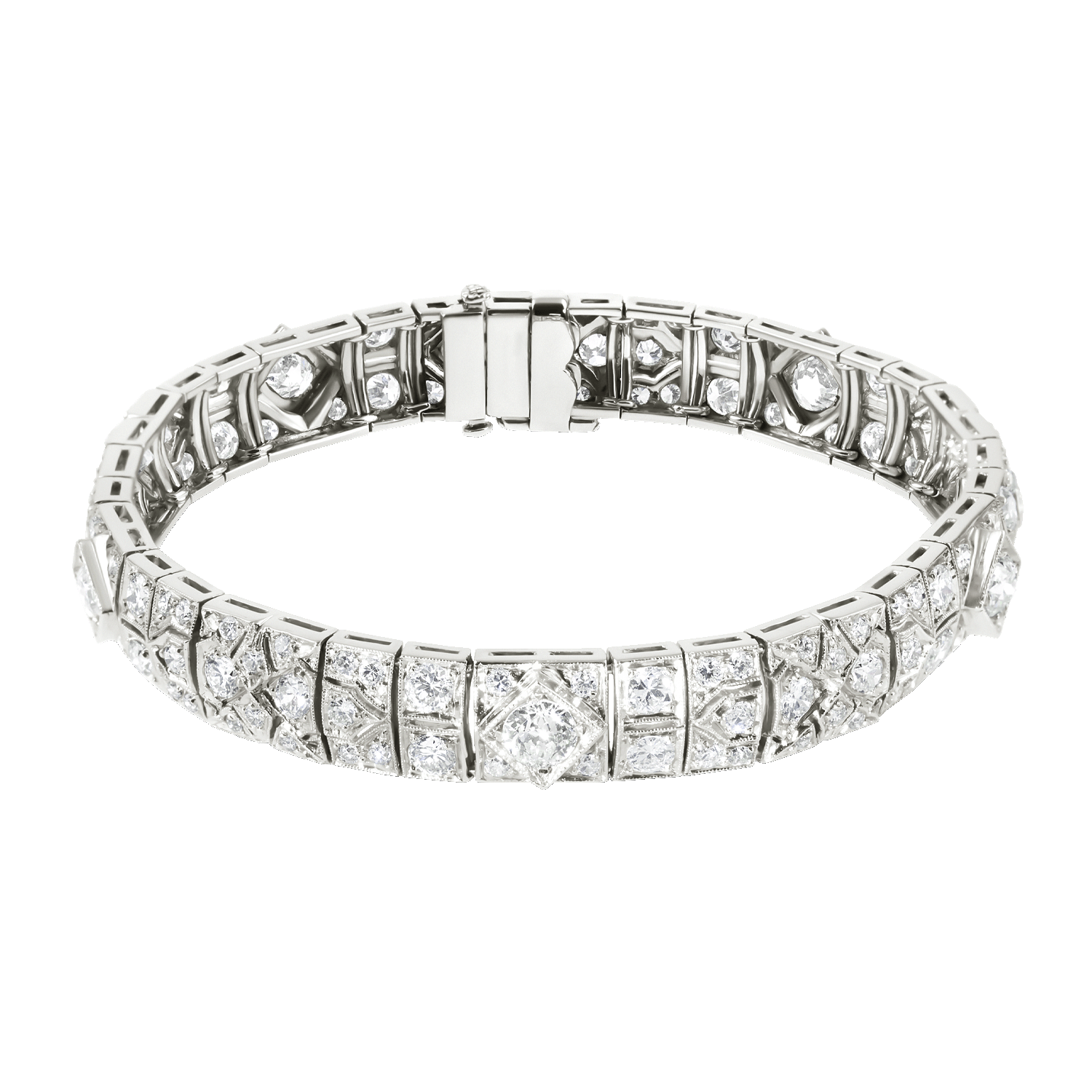 Fast-paced industrialization and new developments pave the way for the transition into modern society, bringing forth the modern woman. She now appears and behaves like the American movie stars – smoking, dancing and listening to jazz. Her hair is short and she is active and boyish. Jewellery from this period suits this image with its geometric, austere and distinct design. Inlays of precious stone, diamonds and enamel yield distinctive pieces of jewellery with stark one colour contrasts. Innovations, such as the invisible setting from Van Cleef & Arpels, also pave the way for unprecedented jewels.