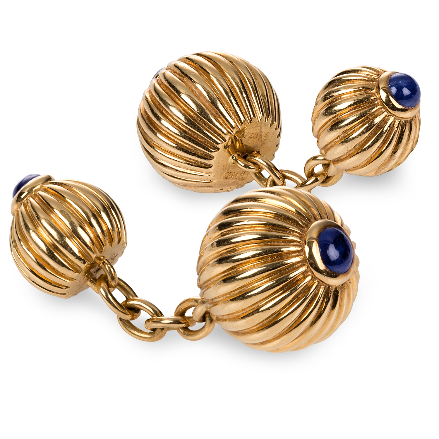 In Gelbgold 18K (750), sportlich dekorative Manschettenknöpfe mit je 2 Kugeln gerillt à ca. 8 + 12 mm Durchmesser, besetzt mit je einem Saphir Cabochon, total ca. 0.4 ct.