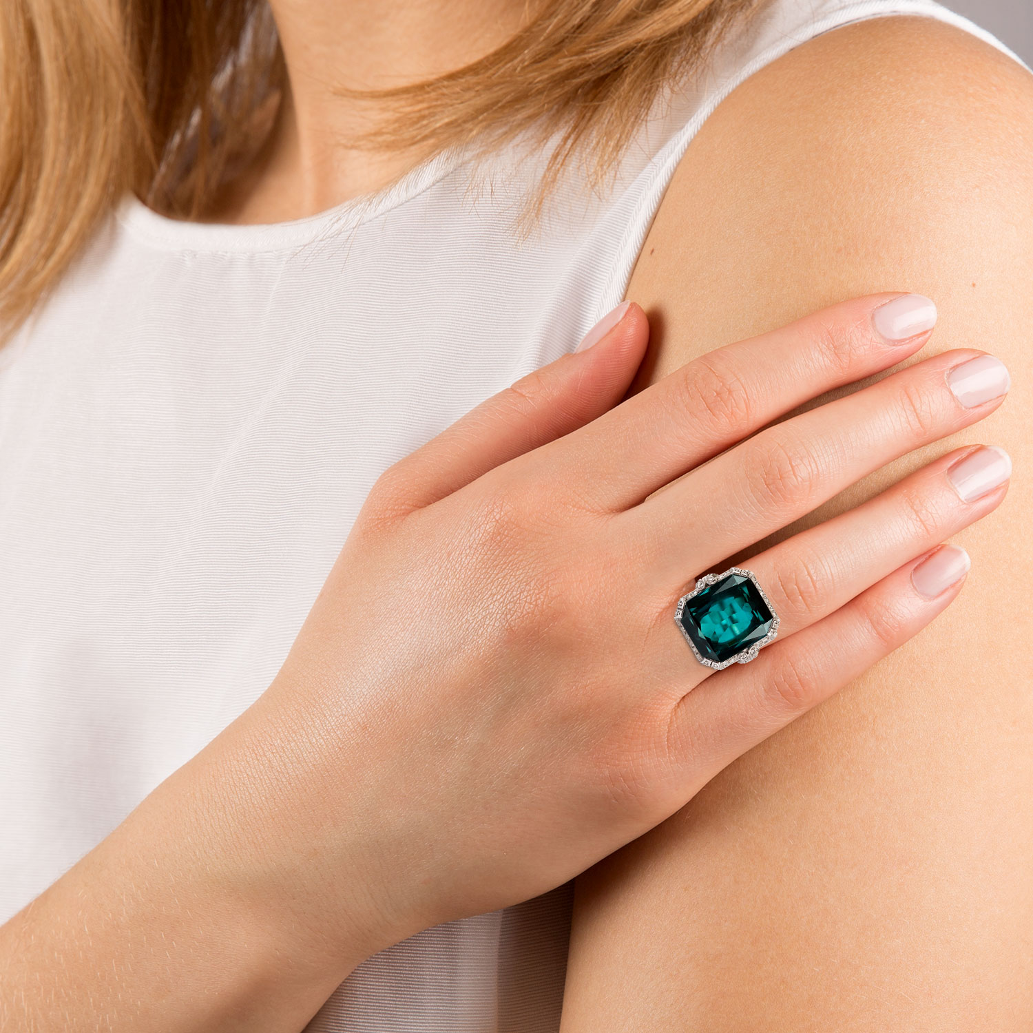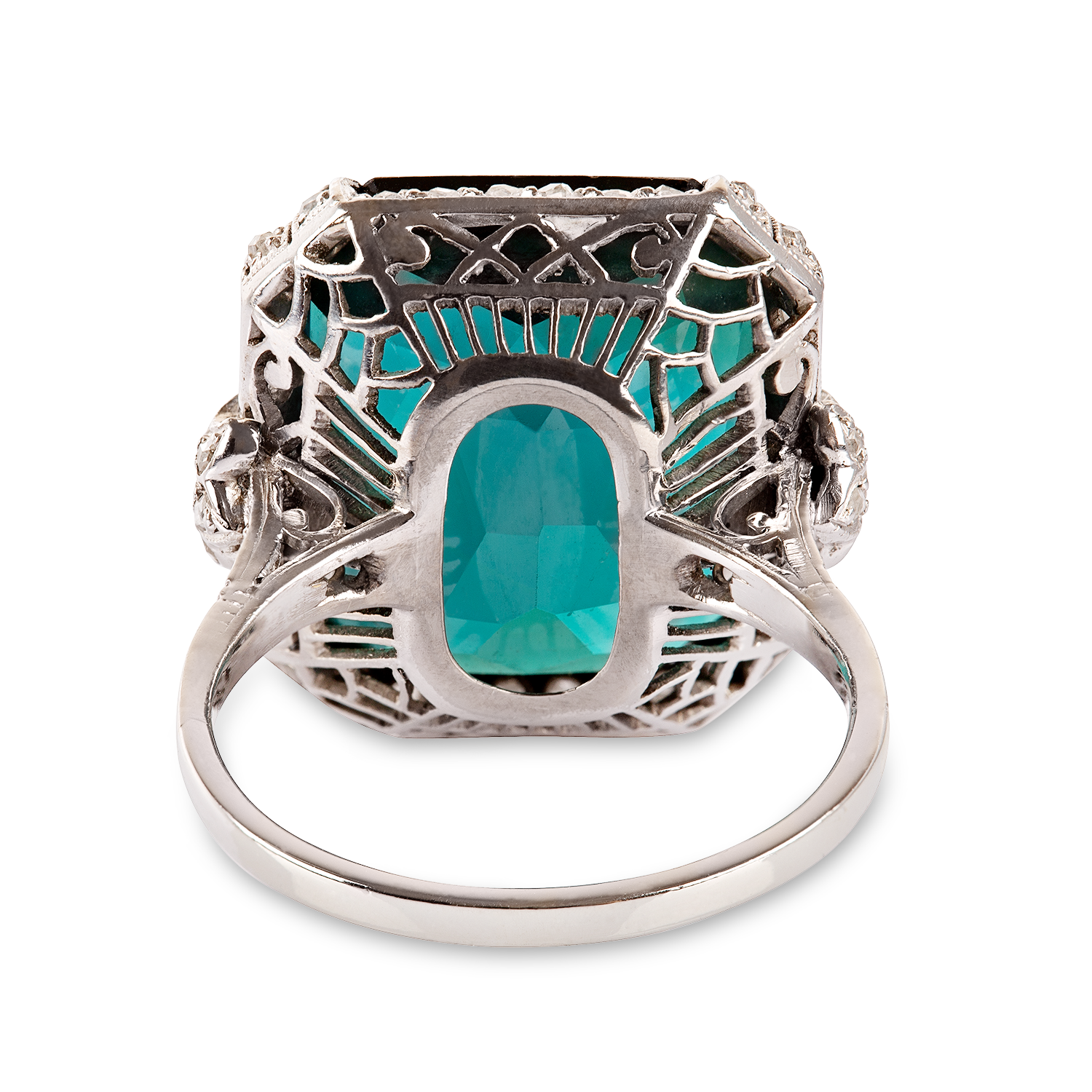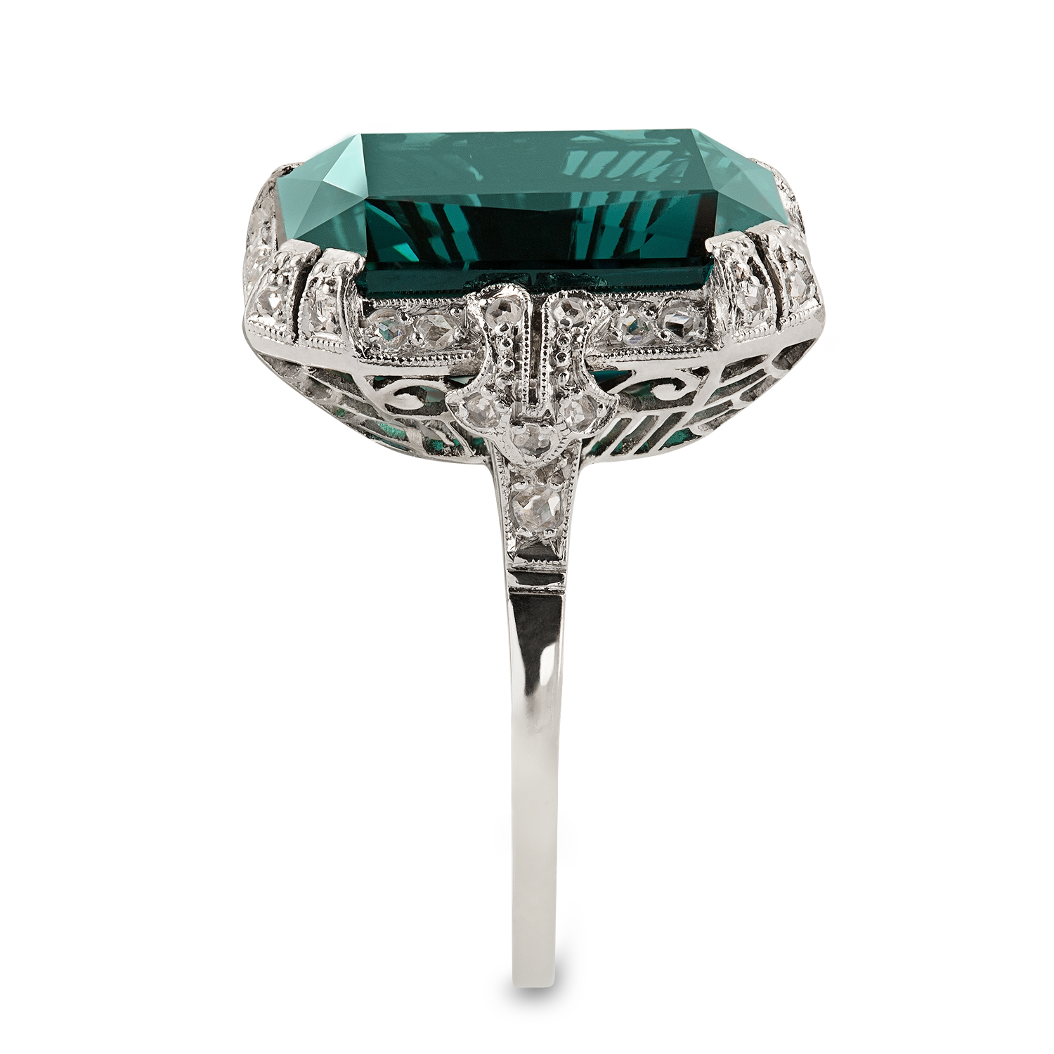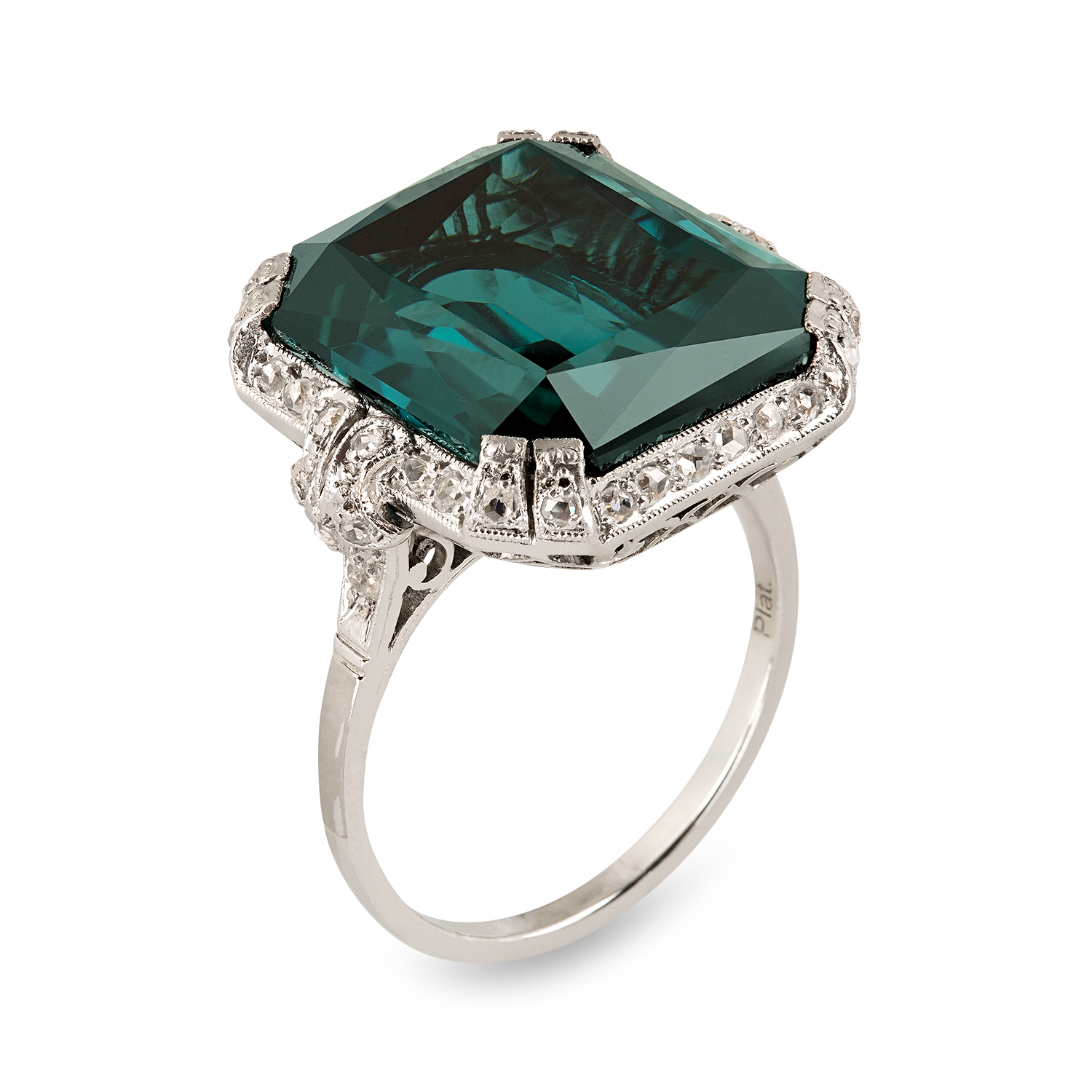 In Platin, besetzt mit einem feinen Indigolith 15.34 ct. 15.73 x 13.72 x 7.96 mm, greenish-blue H, Originalstein nur wenig erhitzt, oktogonaler Scherenschliff, feine Platinfassung besetzt mit kleinen Diamantrosen, handgefertigt