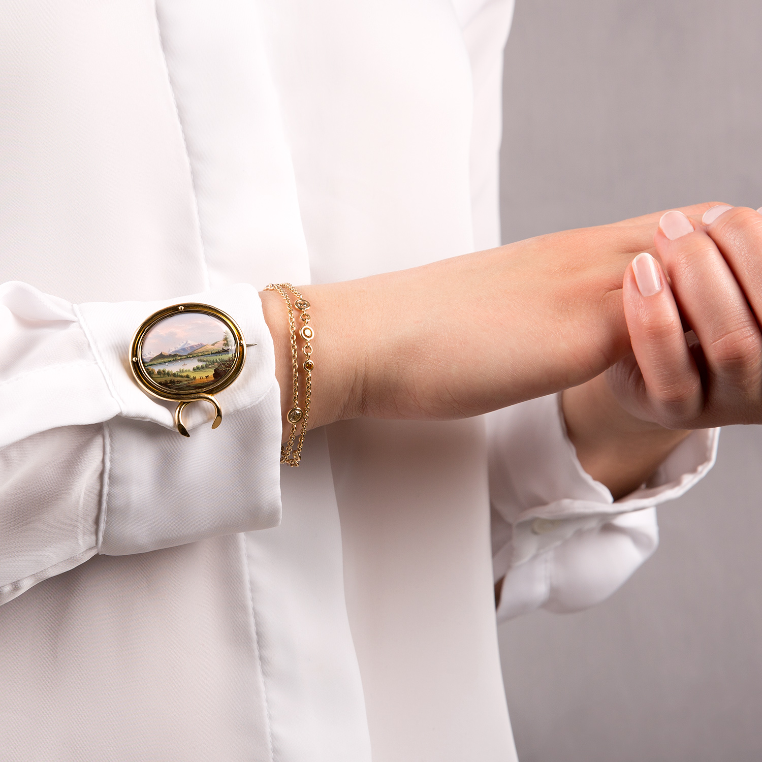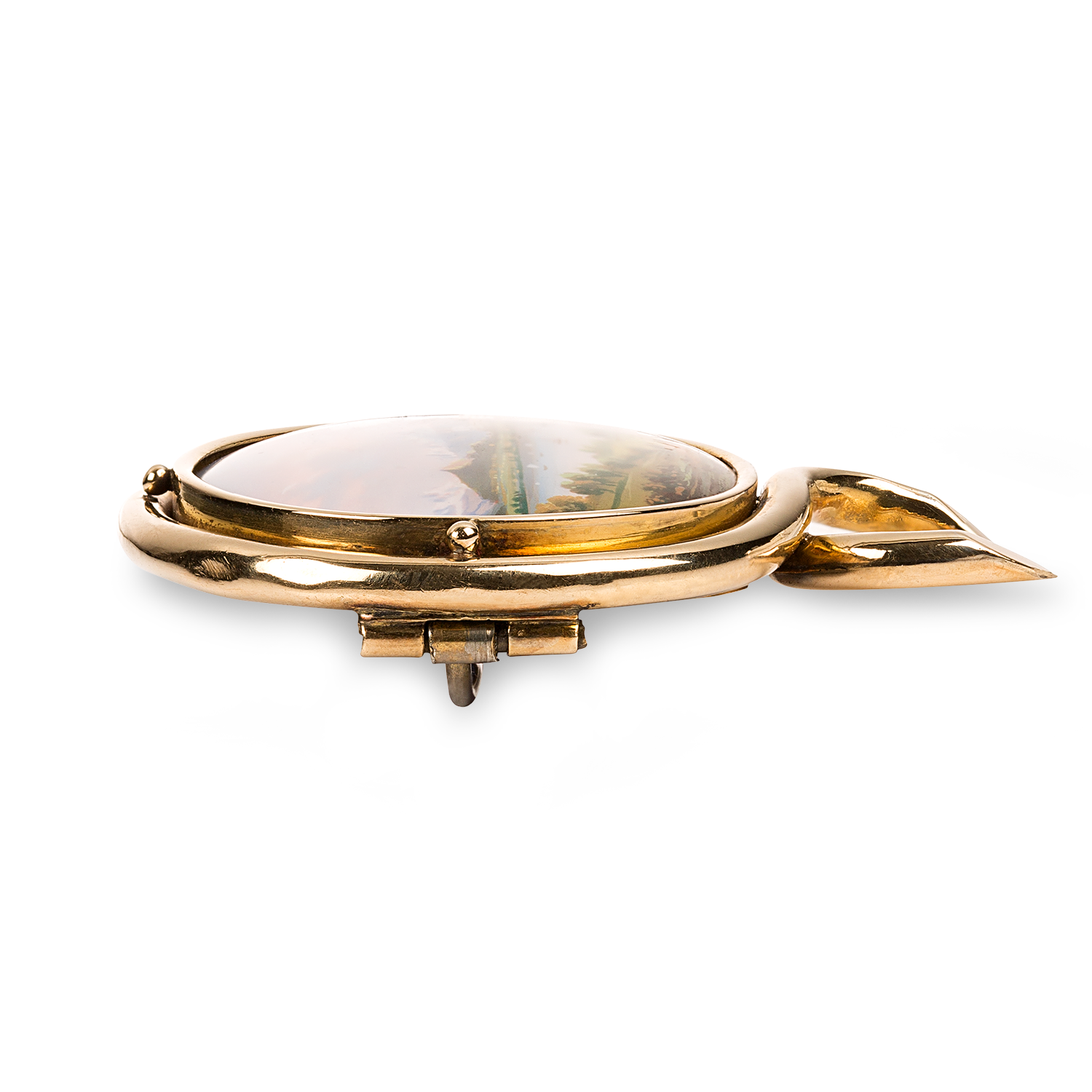 In Gelbgold ca. 18K, dekorativ und fein gearbeitetes Landschaftsbild, Genfer Email, Schweiz um 1840, Broschierungssystem später, Nadel Metall, handgefertigt