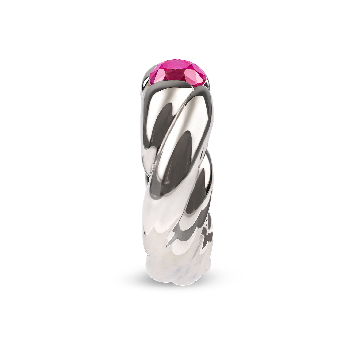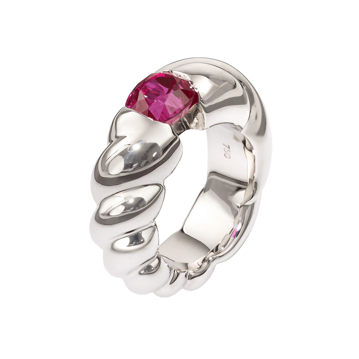 Sehr spezieller Kordel-Design-Ring in Weissgold 18K (750) besetzt mit einem sensationellen Rubin, 2.296 ct., 7.4 x 6.4 x 5.5 mm, unerhitzt, brilliant-step/cushion, vivid pinkish-red, minimale Tragespuren, handgefertigt