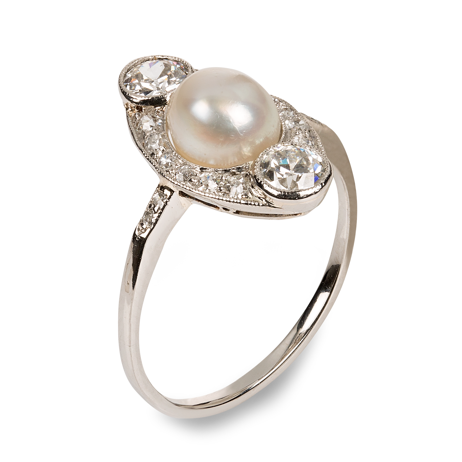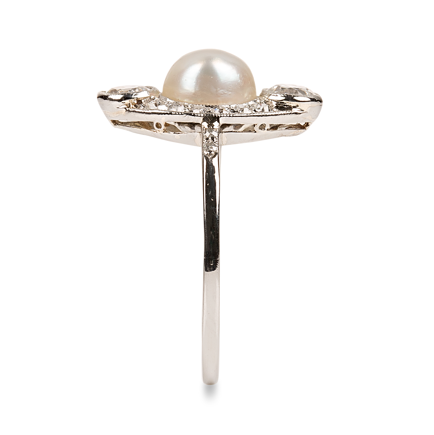 In Platin, Zentrum besetzt mit einer schönen, nicht ganz runden Natur-Salzwasserperle, Durchmesser ca. 7 mm, flankiert von 2 schönen, runden Altschliff-Diamanten von total ca. 0.50 ct. ca. G-H / vs-si, Bordüren mit 16 kleinen korngefassten Diamanten von total ca. 0.20 ct., schöne Handarbeit