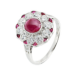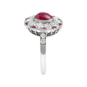 Lieblicher Blumenring in Platin (950), Zentrum besetzt mit einem ovalen Rubin Cabochon ca. 1.2 ct., 7 x 5.9 x 3.1 mm, Burma (Mogok, Myanmar), No Heat, umgeben von 10 schönen Altschliff-Diamanten total ca. 1 ct., sowie dazwischen 10 kleine Rubin-Dreieck Cabochon, Ringschultern besetzt mit 4 Brillanten, hangefertigt