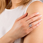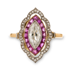 In 18 Karat Gelbgold und 950 Platin, besetzt mit einer Diamant-Navette ca. 0.8 - 0.9 ct. umgeben von einer Rubin-Entourage von 16 Rubinen und einer Entourage von 46 Diamant-Rosen, handgefertigt