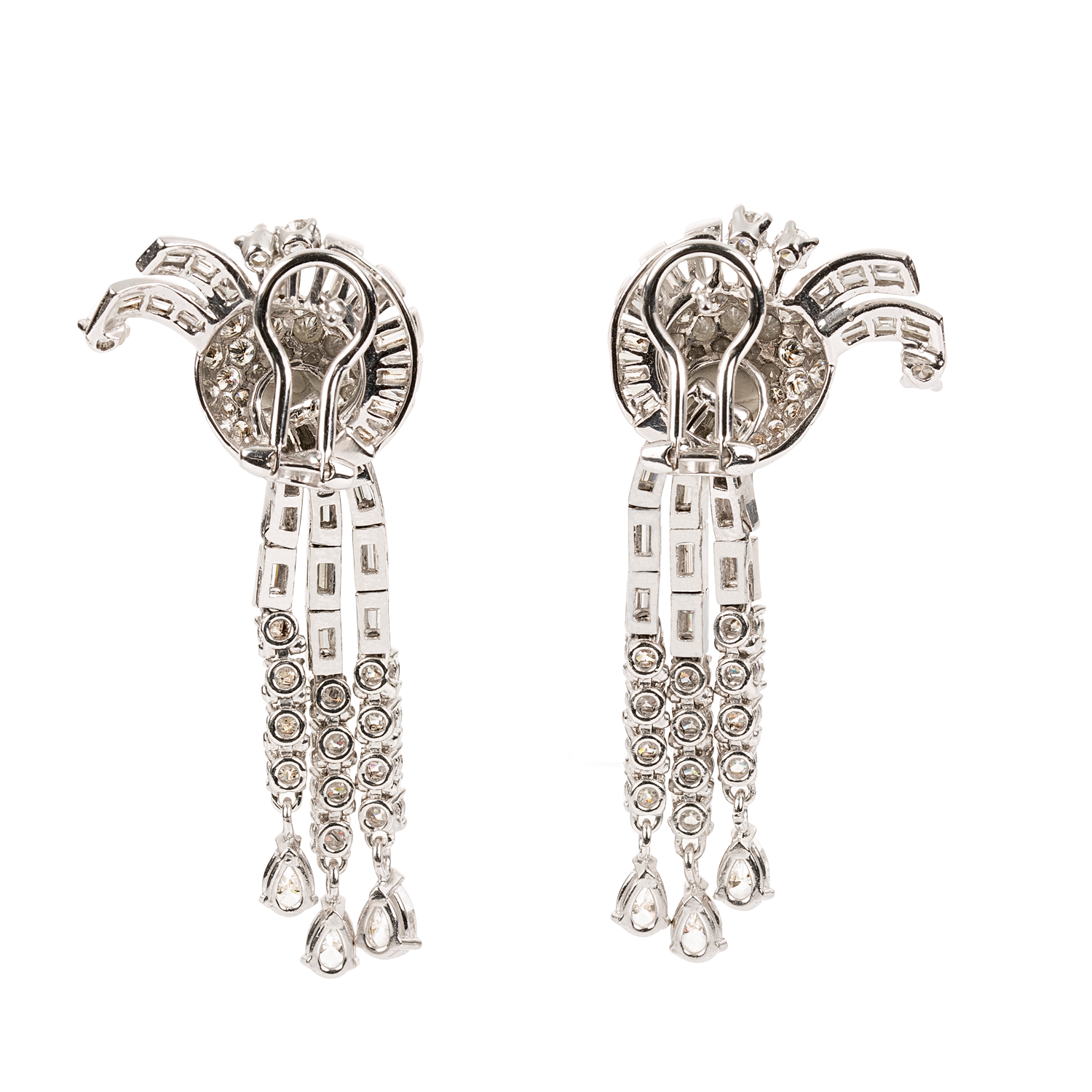 In Platin und Weissgold 14K (585), ausgefasst mit je 26 Diamant-Baguetten, je 38 Brillanten und 3 Diamant-Tropfen, total ca. 10.50 ct. G/H vs., Clipsystem mit Stecker, handgefertigt