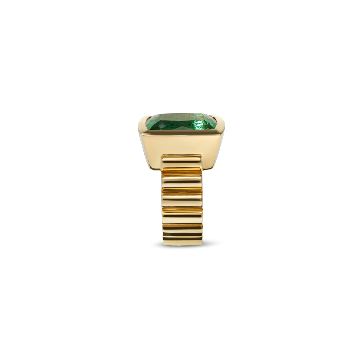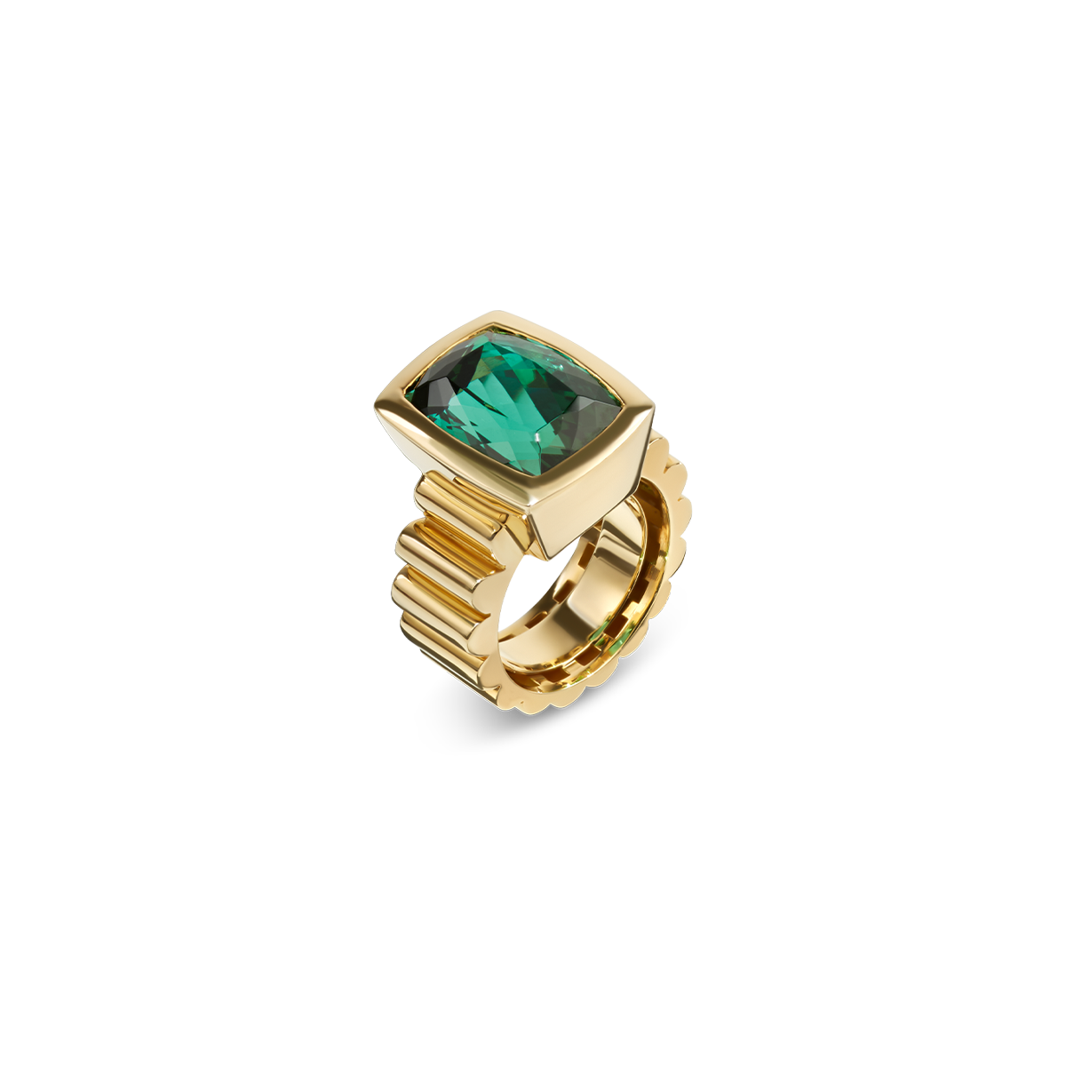 Massiver Ring in Gelbgold 18K (750) mit gerillter Ringschiene, im Zentrum besetzt mit einem natürlichen blaugrünen Turmalin-Cushion (H), ca. 14.5 ct., 16.7 x 12.3 x 9.6 mm, sehr schöne Handarbeit, spezielles Design, Einzelstück