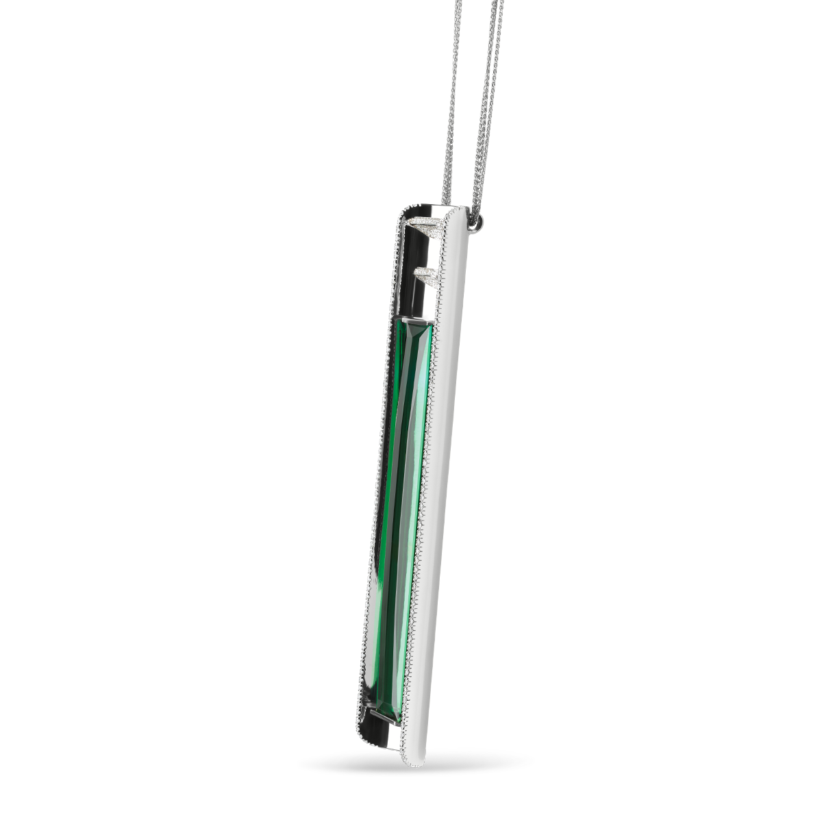 Eleganter Anhänger in Weissgold 18K (750) besetzt mit einem äusserst seltenen, feinen, blaugrünen Turmalin, ca. 65ct., 86.5 x 11.1 x 8mm, gefasst in einem konkaven Halbkreis, Aussenkanten ausgefasst mit kleinen Brillanten, zusätzlich 2 ausgefasste Designelemente, auf einer dreireihigen feinen Fuchsschwanzkette mit Karabinerverschluss