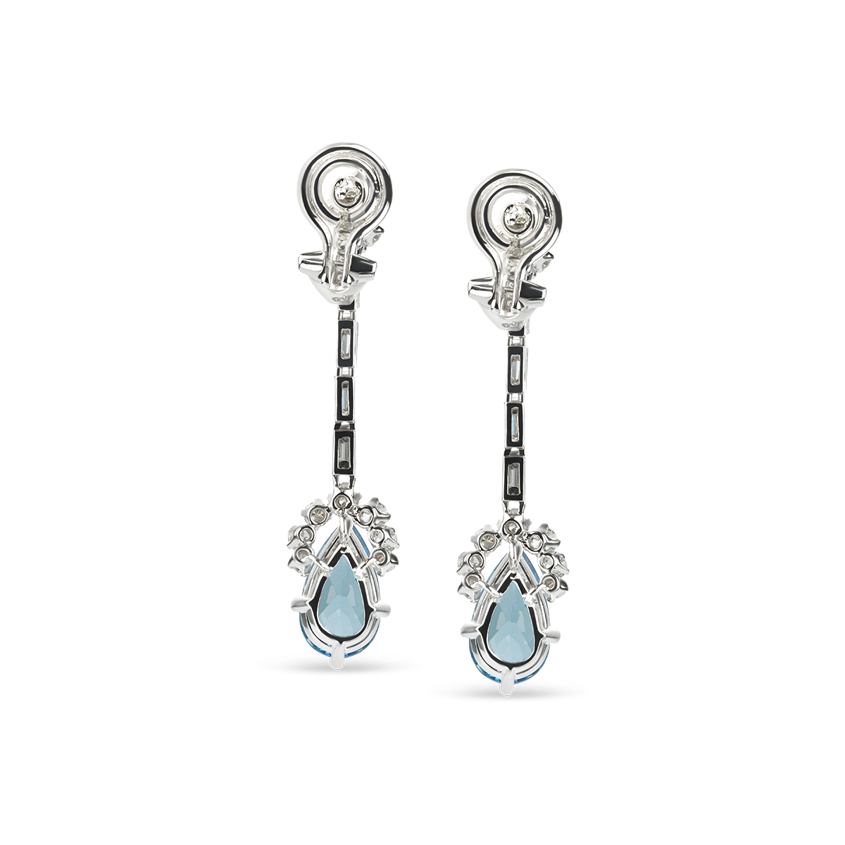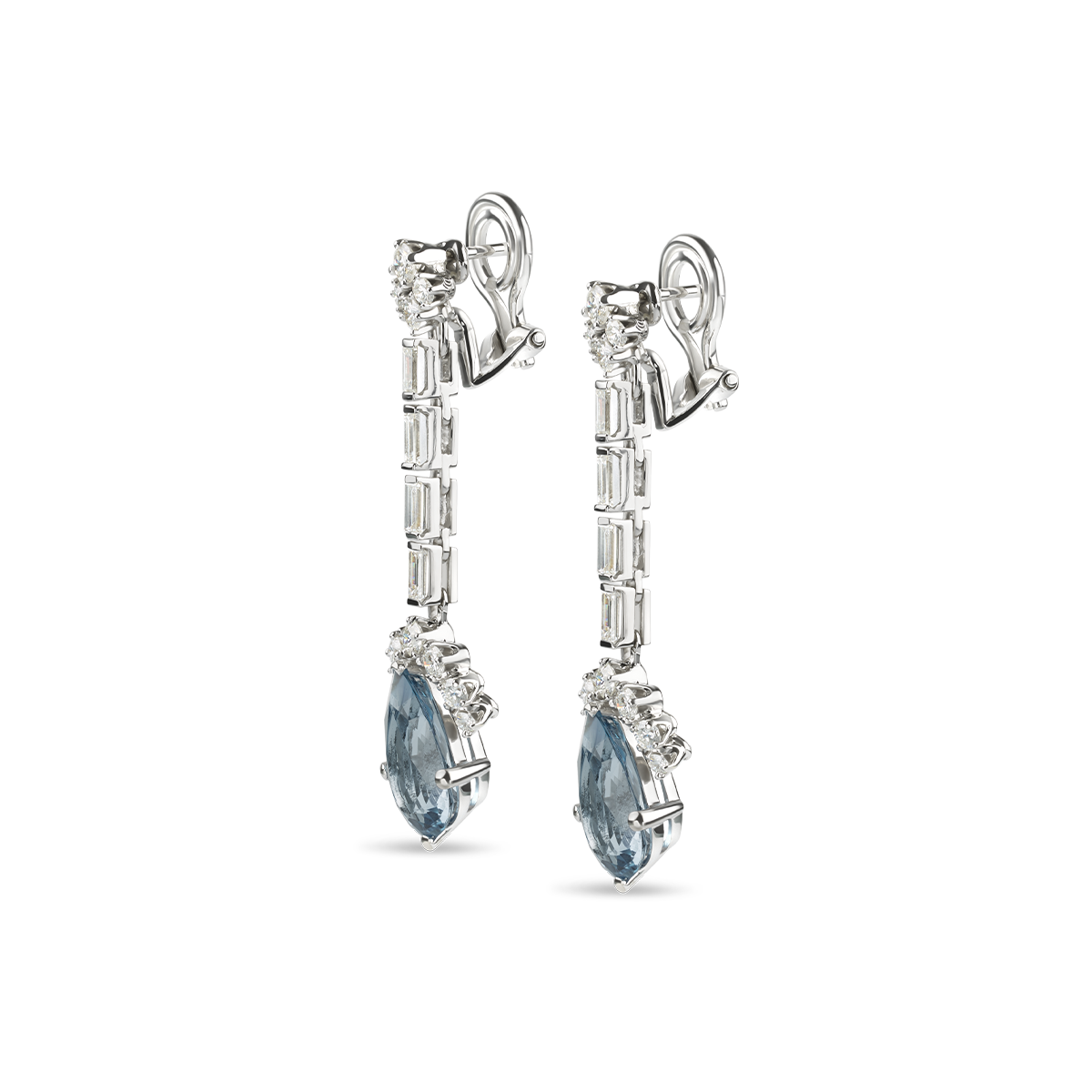 Längliche, klassisch elegante Ohrclips in Weissgold 18K (750) mit je 4 kleinen Brillanten in Chatons gefasst, 4 beweglichen Fassungen mit Diamantbaguetten und einer Halbentourage von 7 kleinen Diamanten im Verlauf, totales Diamantgewicht ca. 1.8ct, wesselton vs, als Abschluss je 1 Aquamarin-Tropfen, sehr feines blau, total ca. 5ct., Bügelclipsystem mit Stift (später angefügt), ganz feine Juwelierarbeit