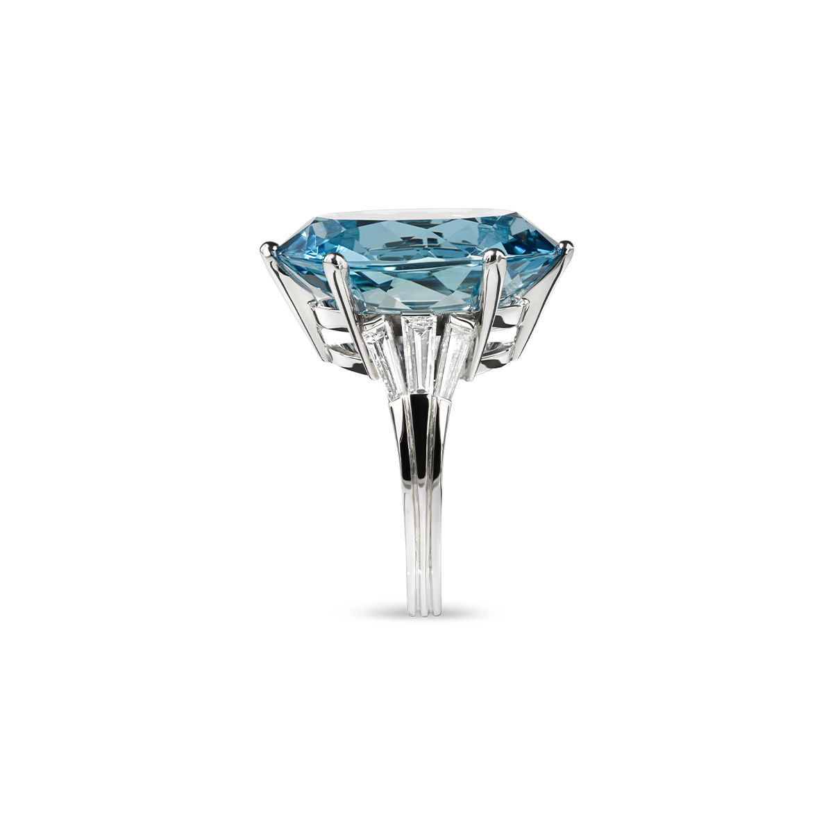Eleganter, feiner Aquamarin-Ring in Weissgold 18K (750), Zentrum besetzt mit einem ovalen Aquamarin, 12.65 ct., 19.99 x 13.83 x 8.12 mm, Natural Beryll, GRS-type "Santa Maria" (Farbe), seitlich flankiert von 6 schönen Diamant-Trapezen total ca. 0.6 ct., top wesselton vs-si, sehr schöne Handarbeit