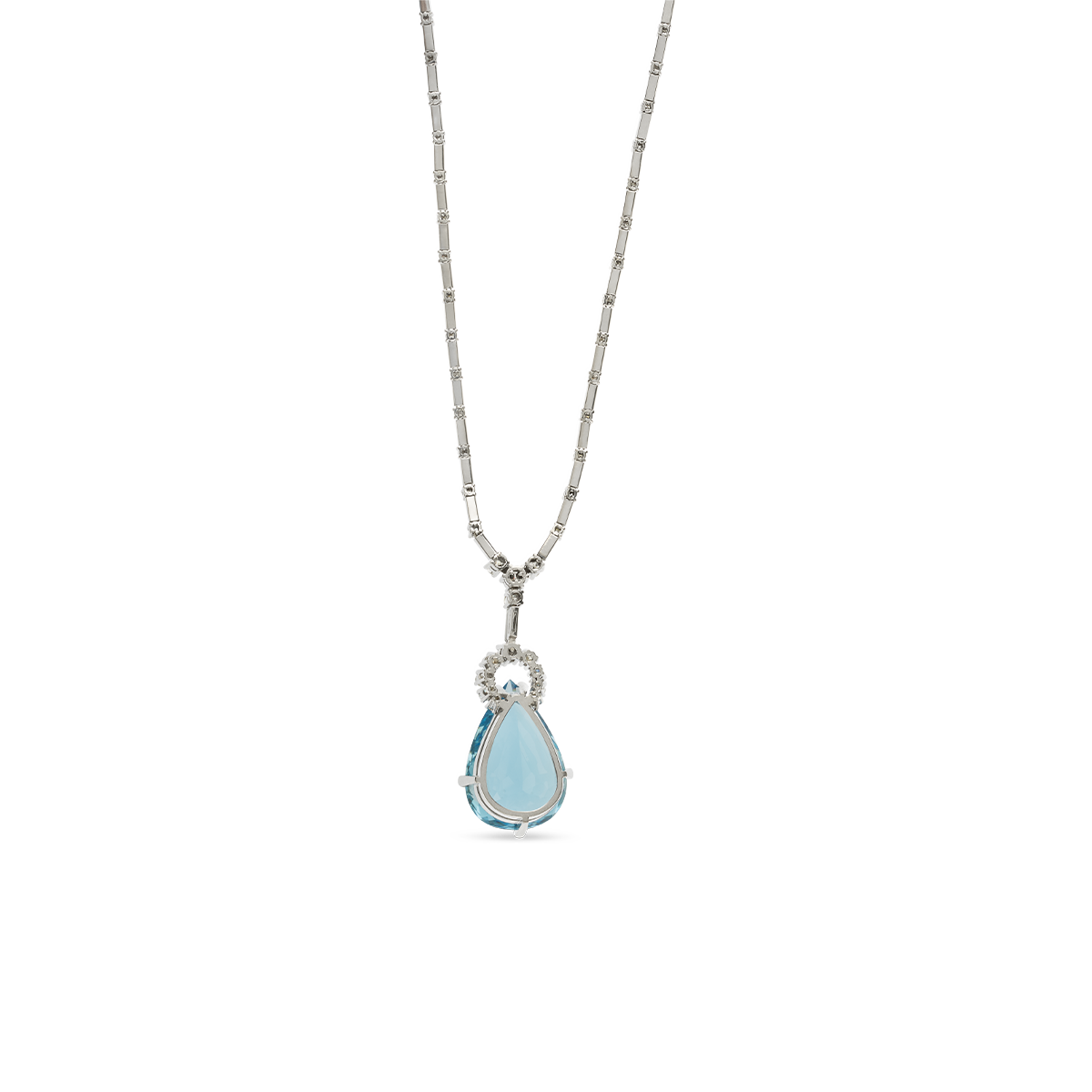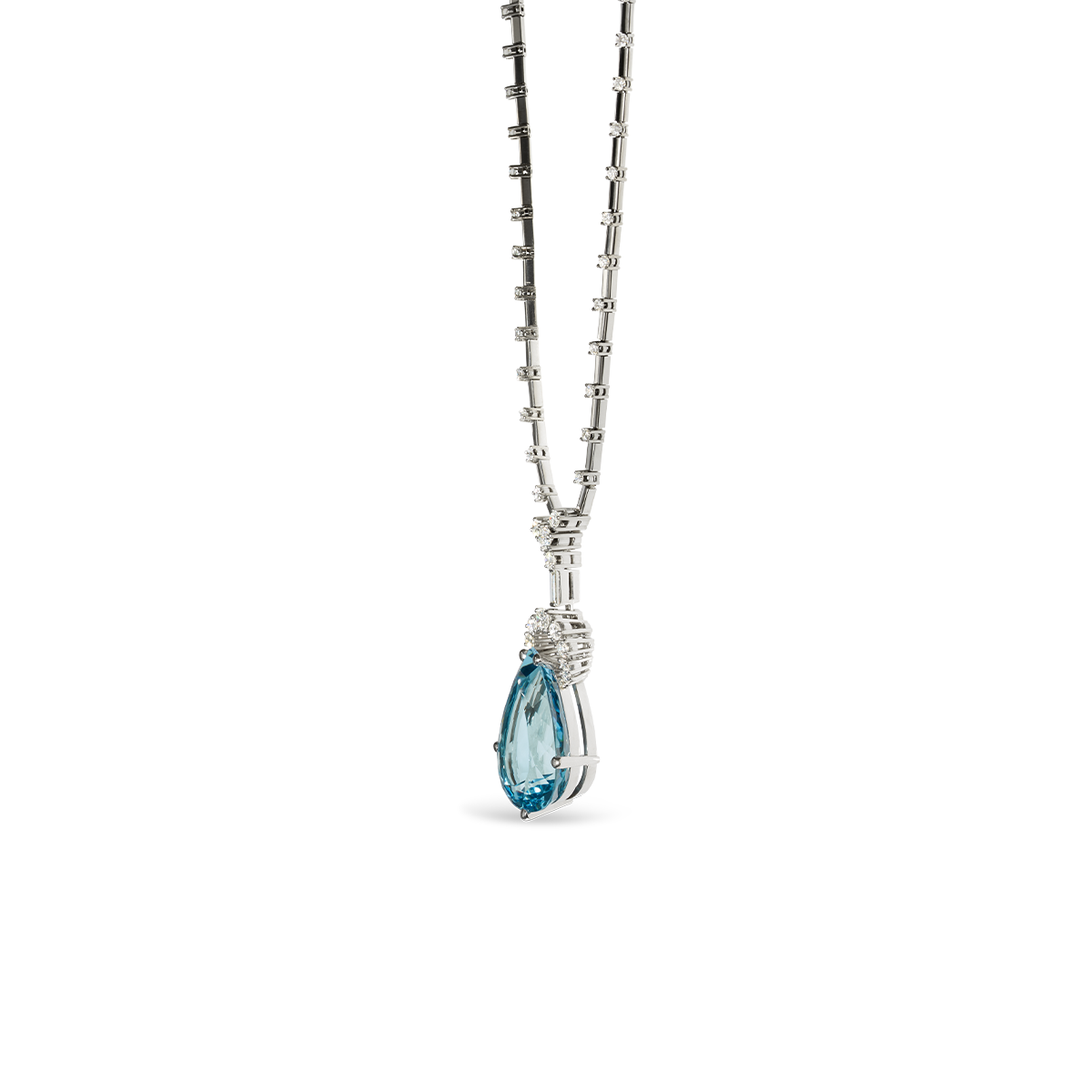 Feines, klassisch elegantes Aquamarin-Collier in Weissgold 18K (750), Collier aus kannelierten Stäbchen mit eingebauter Bewegung, chatongefasste Diamanten von total ca. 1.8ct., wesselton vsi, Anhängerteil aus 4 Brillanten in Chatons, 1 Diamant-Trapez und anschliessend eine Halbentourage aus Diamanten, total ca. 0.8ct., mit feinem Aquamarin-Tropfen von ca. 30ct., 26.8x18.4x11mm, Natural Aquamarine (-Beryl), GRS-type "Santa Maria" (Farbe), ganz feine Juwelierarbeit