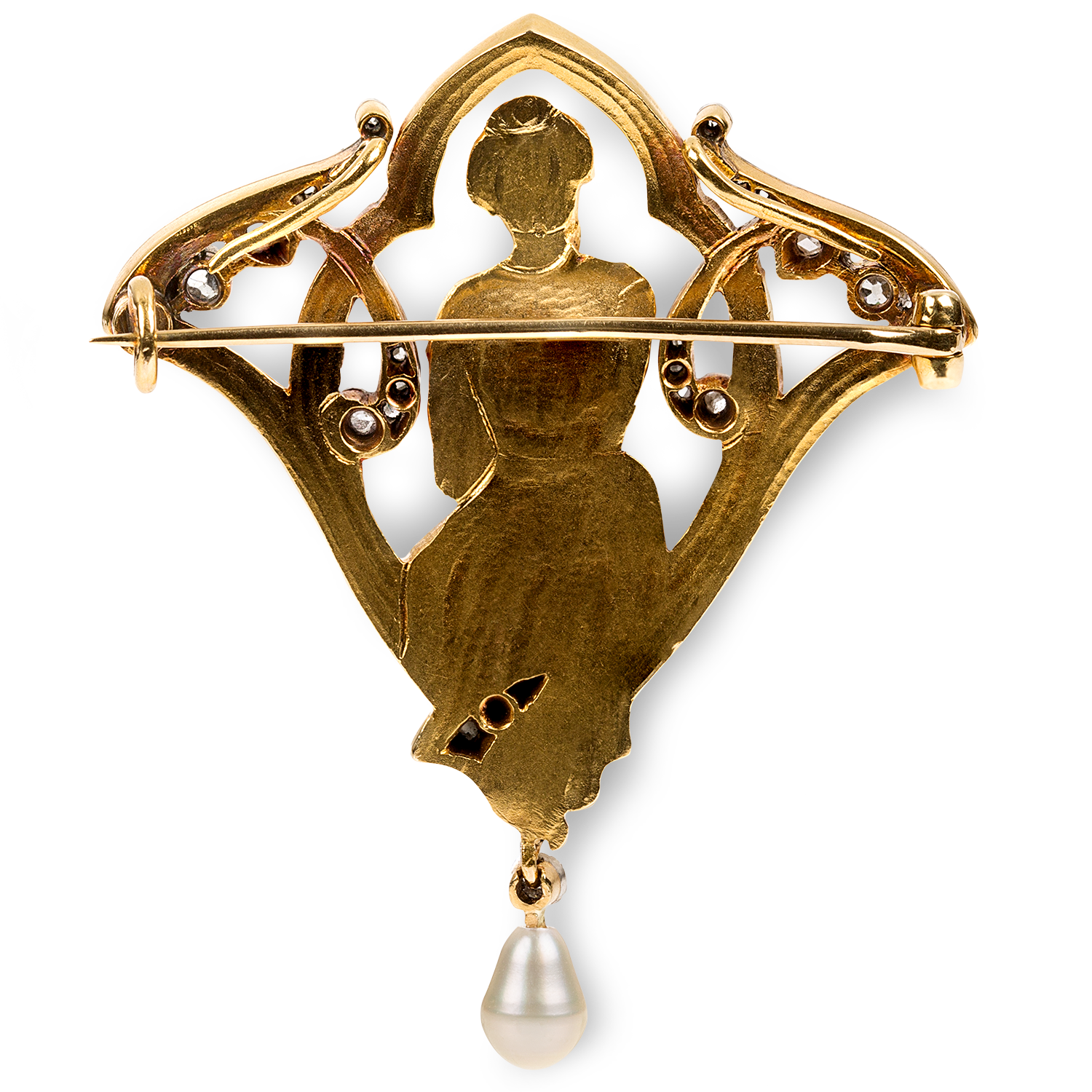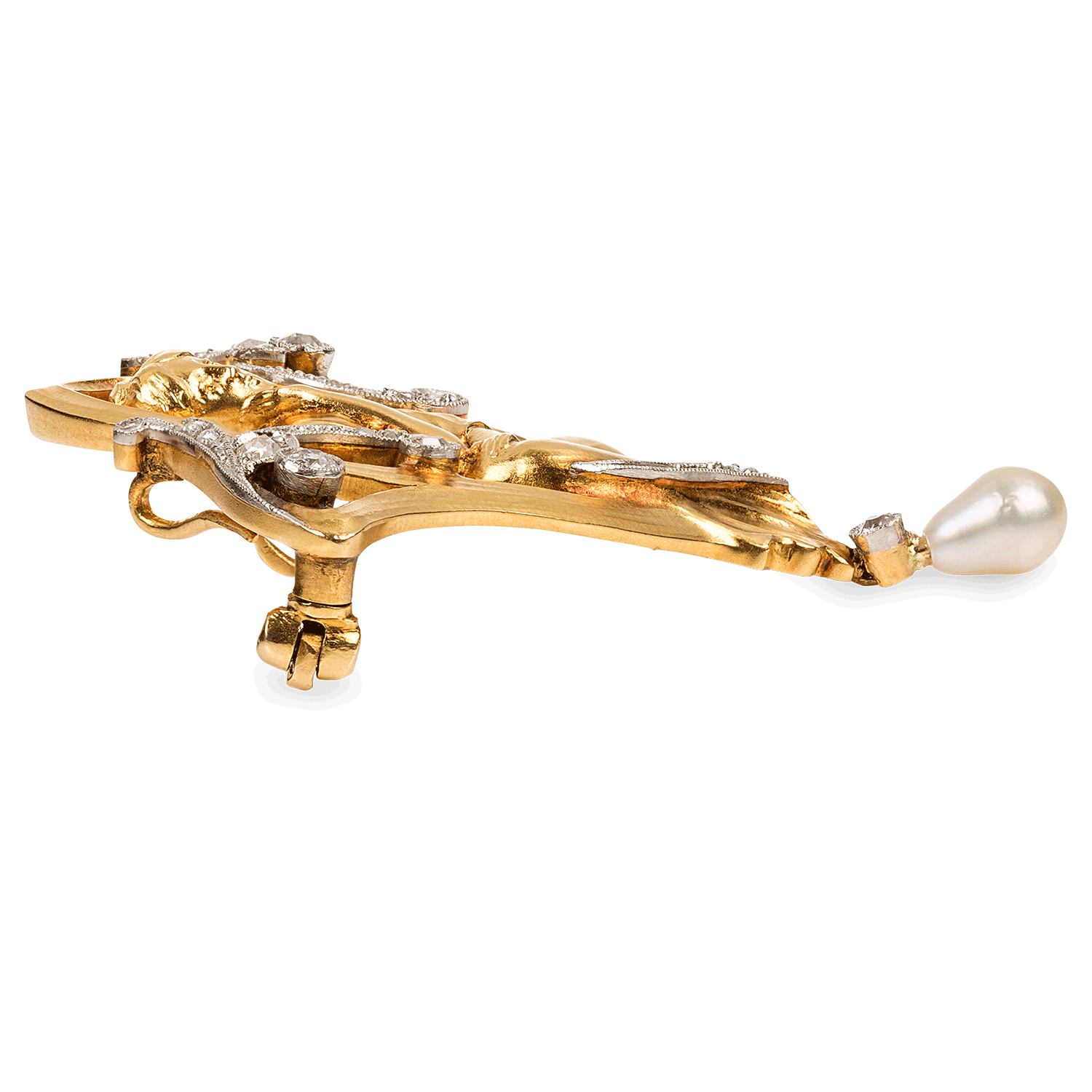 Dekorative, feine Arbeit in Platin und 18K (750) Gelbgold, wohl Frankreich, Frauenmotiv, besetzt mit einer schönen echten Tropfenperle, 3 Altschliff-Diamanten und 19 Diamant-Rosen, perfekter Originalzustand, handgefertigt