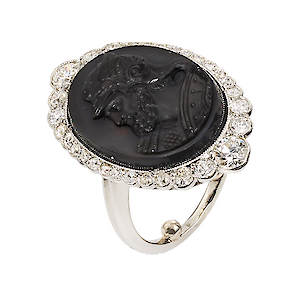 Sehr feiner Damenring in Platin, Zentrum besetzt mit einem Onyx mit sehr fein positiv graviertem Merkur-Kopf, ca. 13 x 17 mm, umgeben von einer Diamant-Entourage im Verlauf, total ca. 0.70ct., ausserordentliche feine Säge-Handarbeit