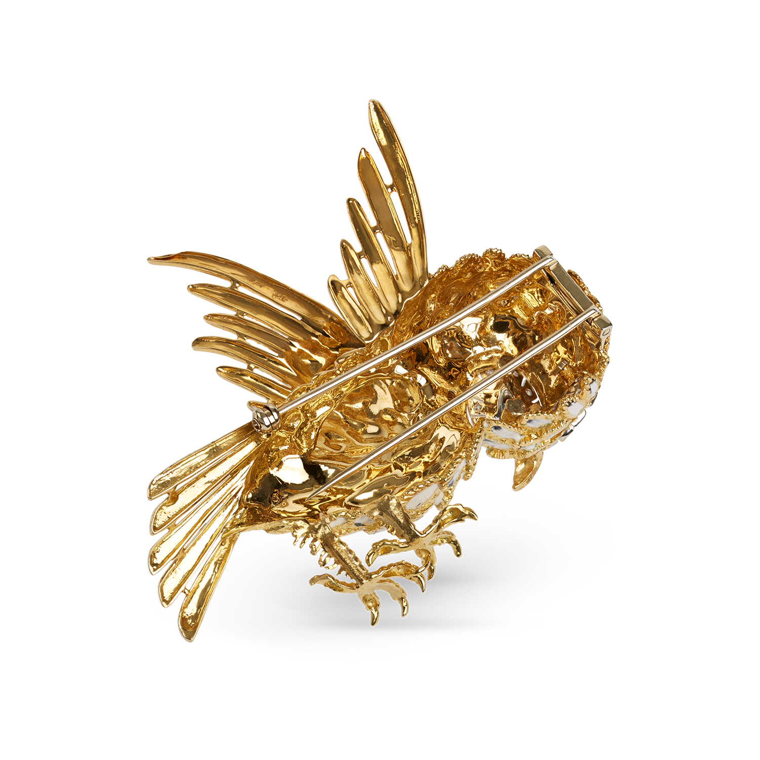 Wunderschöne Email-Edelstein-Brosche in 18K (750) Gelb- und Weissgold, plastisch gestaltete Eule, Augenpartie besetzt mit Diamanten und 2 Saphir-Navetten, Kopf (mit Verschraubung montiert) und Gefieder teils strukturiert und weiss-schwarz emailliert, Doppelbroschierung, schöne Handarbeit