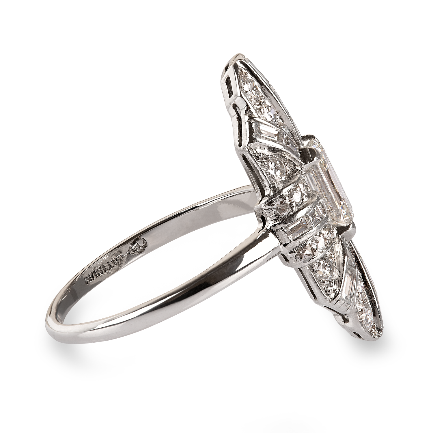 In Platin (950/1000), Zentrum besetzt mit 1 Diamant im Emerald-Cut, Farbe ca. G-F/vs2 umgeben von 20 kleinen Diamant-Baguetten total ca. 0.65ct. top wesselton/vs-si und 32 Diamanten z.T. 8/8-Schliff und Vollschliff, sehr schöne Handarbeit