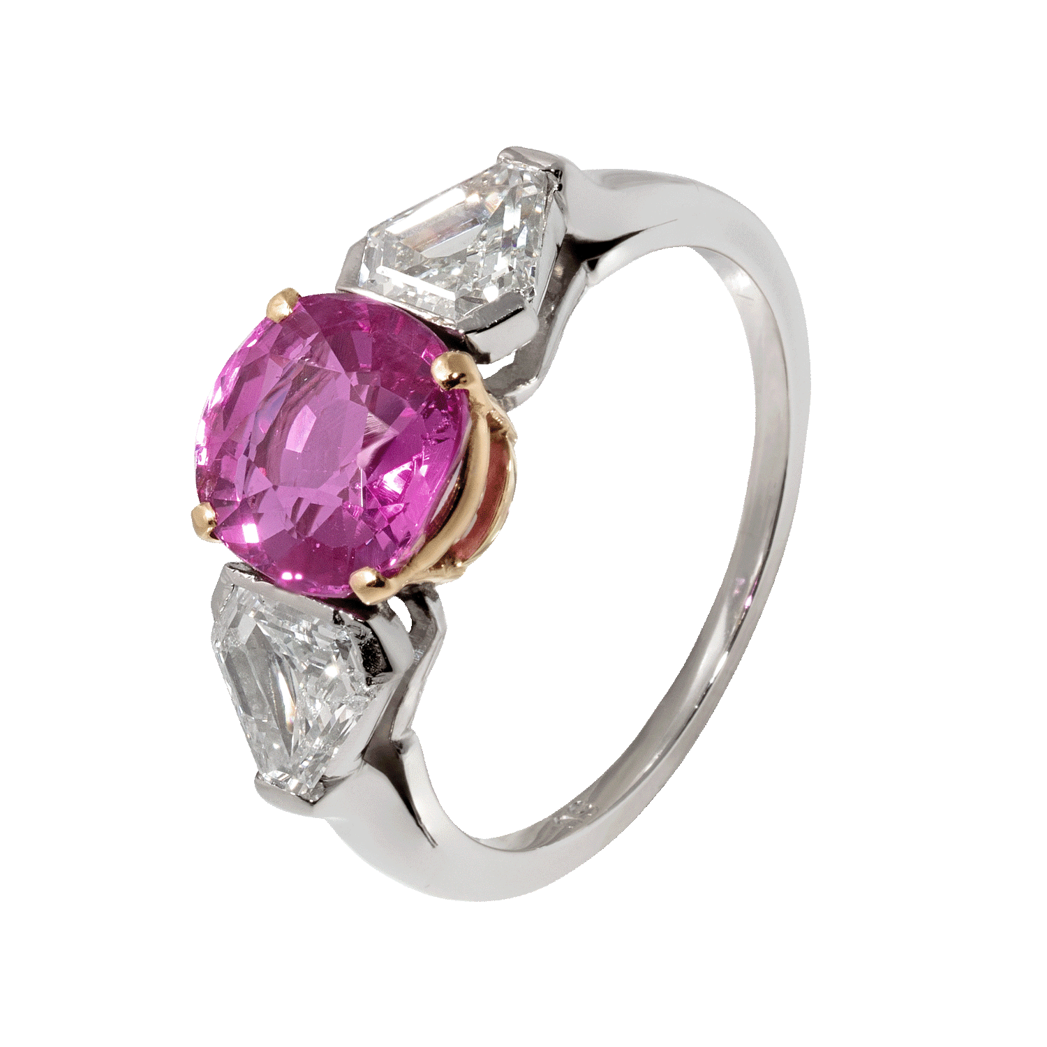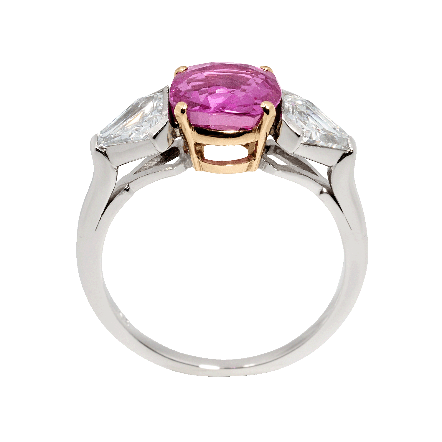 Wunderschöner klassischer Damenring in Platin 950 und 750 Roségold, Zentrum besetzt mit einem feinen Burma-Pinksaphir von ca. 2.8ct. unerhitzt, 8.04 x 7.74 x 4.42 mm, flankiert von 2 Diamanten Bullhead, total ca. 0.4ct. G vs, handgefertigt