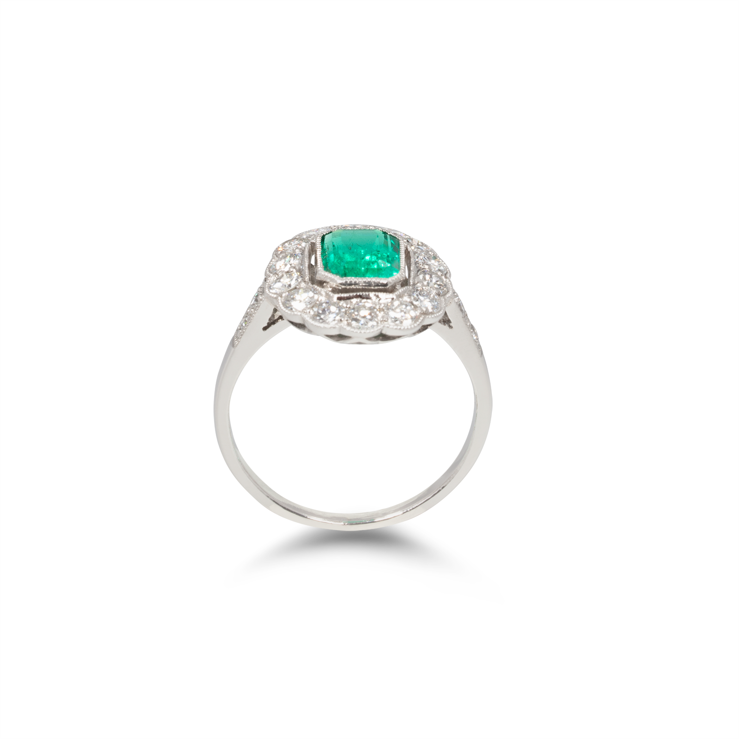 In Platin (950), wunderschöner Damenring, im Zentrum 1 Smaragd im Smaragdschliff (Tragespuren), feine Farbe, ca. 1.1ct. (Kolumbien), umgeben von einer Entourage von 18 Diamanten korngefasst, total ca. 0.55ct., schöne Altschliff-Steine, feine Handarbeit