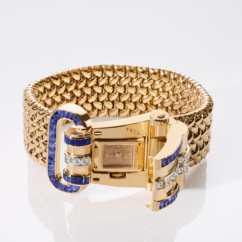 In Roségold 18K (750), Gehäuse und Band besetzt mit 28 kalibrierten feinen Saphiren vivid-blau, 22 Carré-Saphiren und speziell eingeschliffenen Saphiren total ca. 7 ct., sowie 21 Brillanten total ca. 1 ct. top wesselton W, vs-vvs korngefasst im Verlauf von 2-2.9 mm in Weissgold, mechanisches Werk mit Handaufzug, revidiert, wenig getragen, schwere Ausführung, handgefertigt