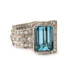 In Platin (950), effektvolles Retrodesign, Frankreich, besetzt mit einem feinen, octagonalen Aquamarin ca. 12.4 ct. 15.9 x 12.9 mm, pastel blue erhitzt, gebänderte Schauseite ausgefasst mit Brillanten, gute Handarbeit