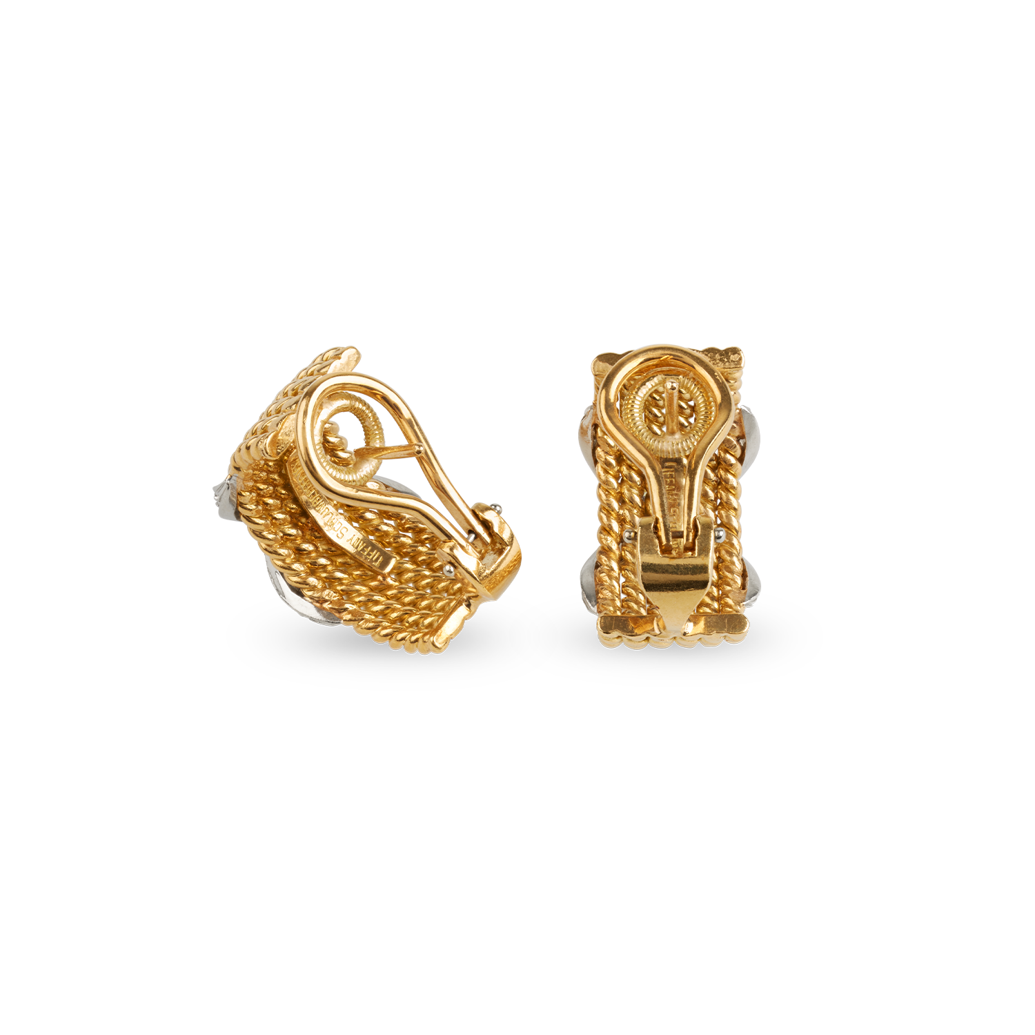Elegante Ohrclips in Gelb- und Weissgold 18K (750), 6 Gelbgoldkordeln zu einem Band im Halbkreis geformt, darüber zwei gekreuzte Weissgoldbänder besetzt mit 30 Diamanten, top wesselton vsi, total ca. 0.5ct., mit Bügel und Stiftsystem, Design nach Schlumberger, schöne Handarbeit