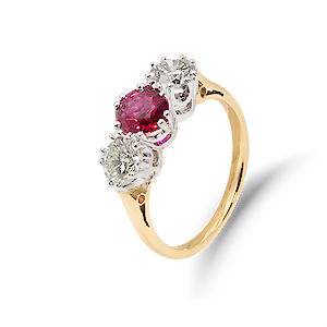 In Gelb- und Weissgold 18K (750), eleganter Damenring mit 3 Steinen, im Zentrum besetzt mit 1 ovalen feinen Burmarubin von 1.06 ct., unerhitzt, flankiert von 2 Brillanten total ca. 0.9 ct. H-I si, handgefertigt