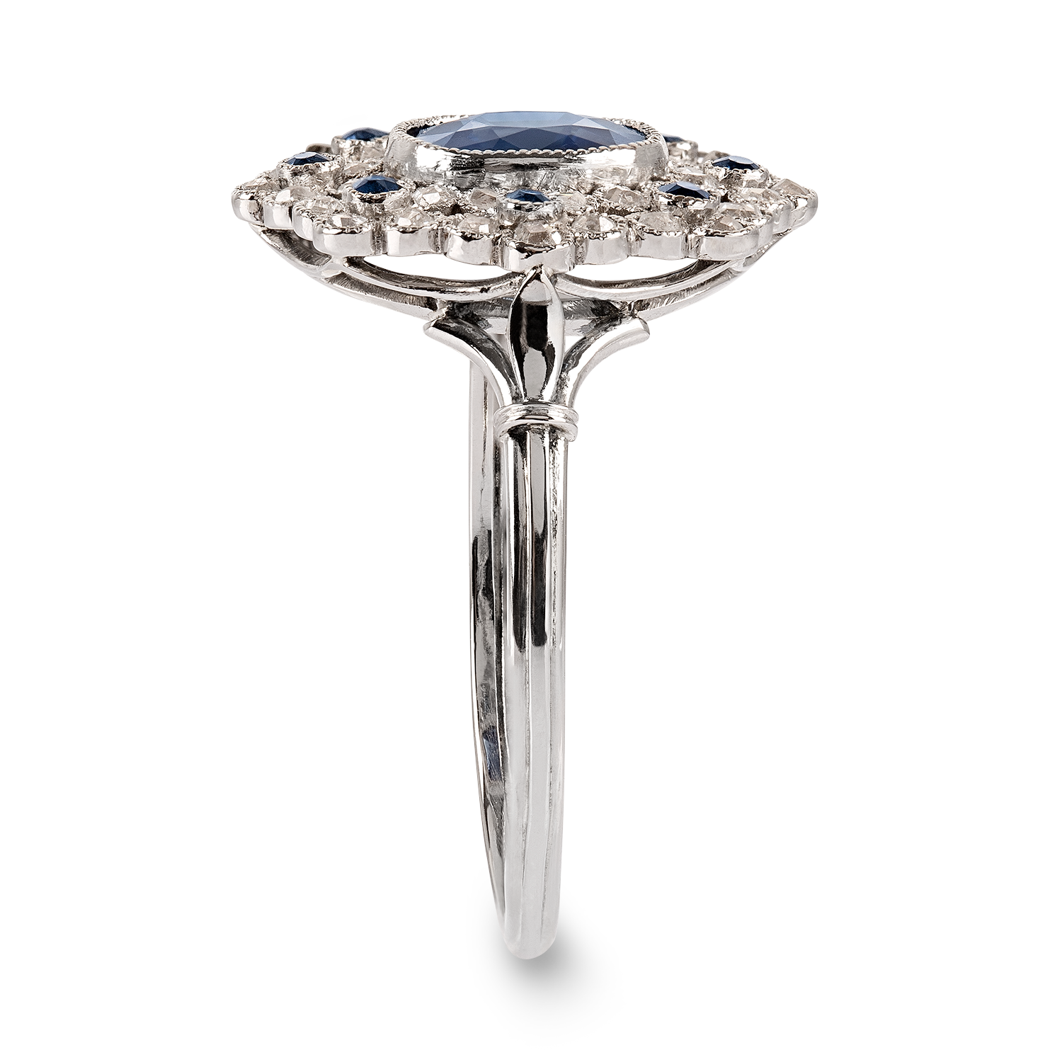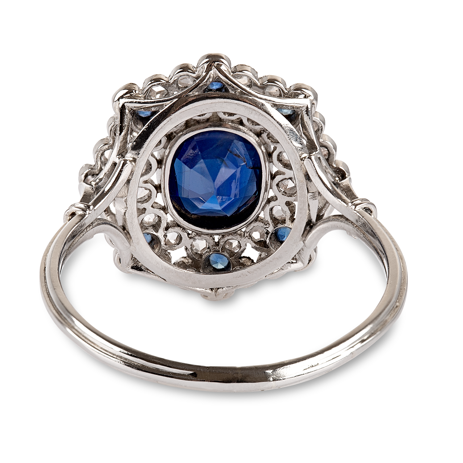 In Platin (950), äusserst feiner, lieblicher Saphir-Blümchenring, besetzt mit einem ovalen Saphir 1.1 ct. 6.8 x 5.8 x 3.4 mm, unerhitzt, Herkunft Kanchanaburi Thailand, sowie 8 kleinen Saphiren und 40 Diamantrosen, der Saphir war in der Aristokratie, oft zusammen mit Diamanten für Verlobung/Hochzeit ein Zeichen der Liebe, dazu 8 glückbringende Blümchen, Saphir als Liebesstein, handgefertigt