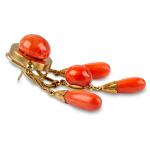 Ohrhänger in Gelbgold 15‒18K (625‒750), dekorative viktorianische Ohrclips im archäologischen Stil, ca. um 1870 (Clipsystem später montiert), besetzt mit je 1 lachsroten Korallen-Bouton, Durchmesser 11.5 mm, darunter an feinen Fuchsschwanzketten montierte Pendentifs mit je 3 Korallentropfen, ca. 14 x 17 mm sowie je 1 Bouton von Durchmesser ca. 9.7 mm (Mittelmeerkorallen), handgefertigt