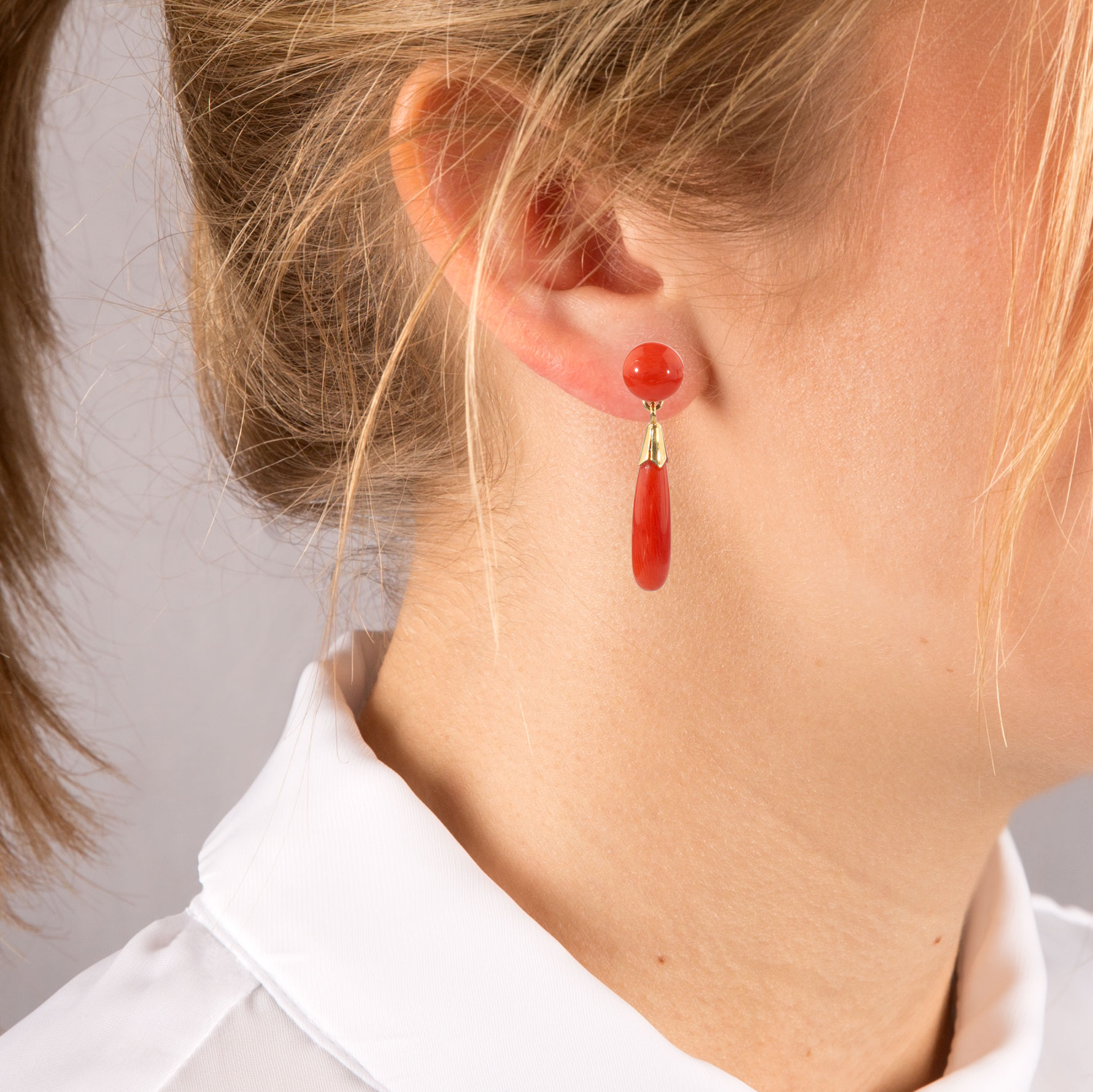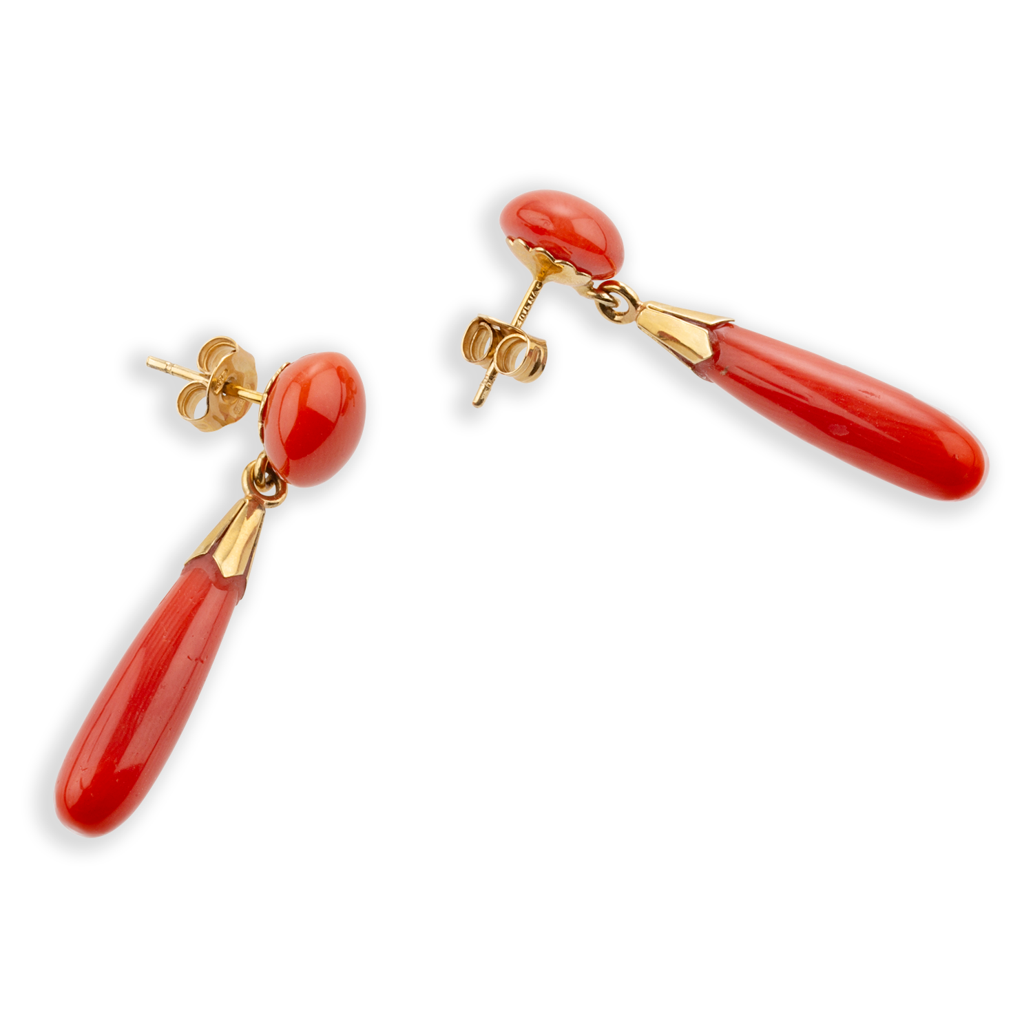 In Gelbgold 18K (750), besetzt mit je 2 schönen Mittelmeer-Korallen (wohl Italien) in Bouton und Tropfenform, Stecksystem, handgefertigt