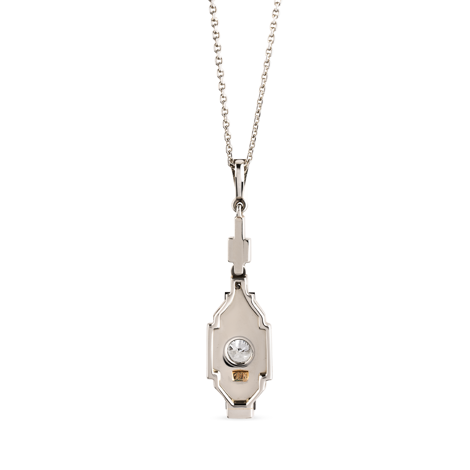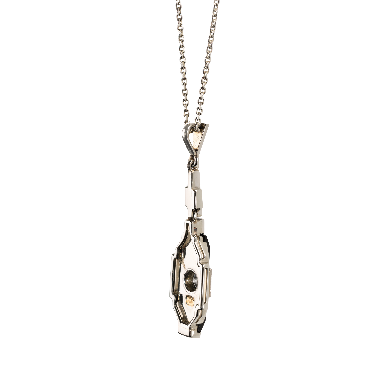 in Weissgold 18K (750) mit Platinauflage, Zentrum besetzt mit einem Altschliff-Diamant ca. 0.23ct., 2 kleine Altschliff-Diamanten sowie 2 Onyx-Plättchen, inkl. Ankerkettchen in Weissgold 18K (750) mit Federring, schöne Goldschmiedearbeit, handgefertigt